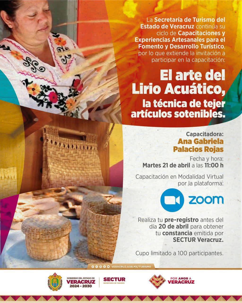 El H. Ayuntamiento de Cazones de Herrera, Veracruz, a través de la Secretaría de Turismo del Estado de Veracruz y en coordinación con la Dirección de Turismo Municipal, extiende una cordial invitación a la ciudadanía para participar en la capacitación virtual “El arte del lirio acuático: la técnica de tejer artículos sostenibles”.