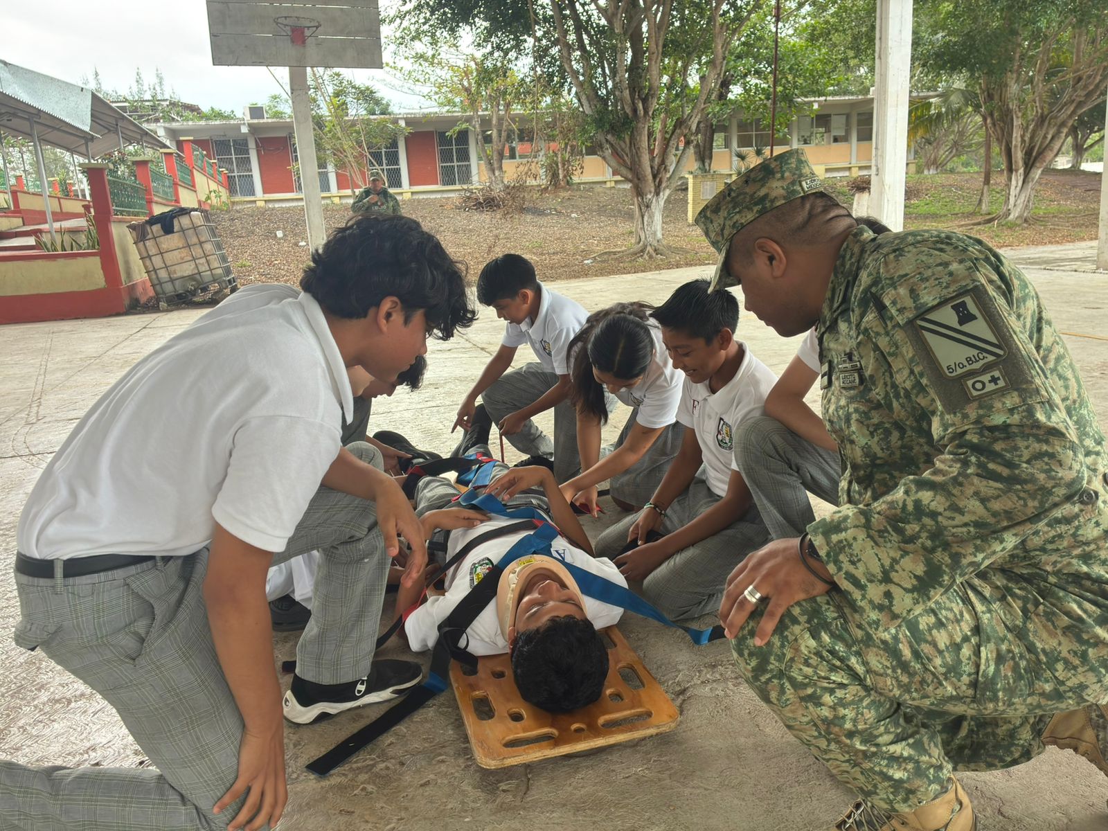 Durante el encuentro, realizado en las instalaciones de la Escuela Secundaria General «Constituyentes de Querétaro», el personal militar compartió sus conocimientos y experiencias en materia de primeros auxilios.
